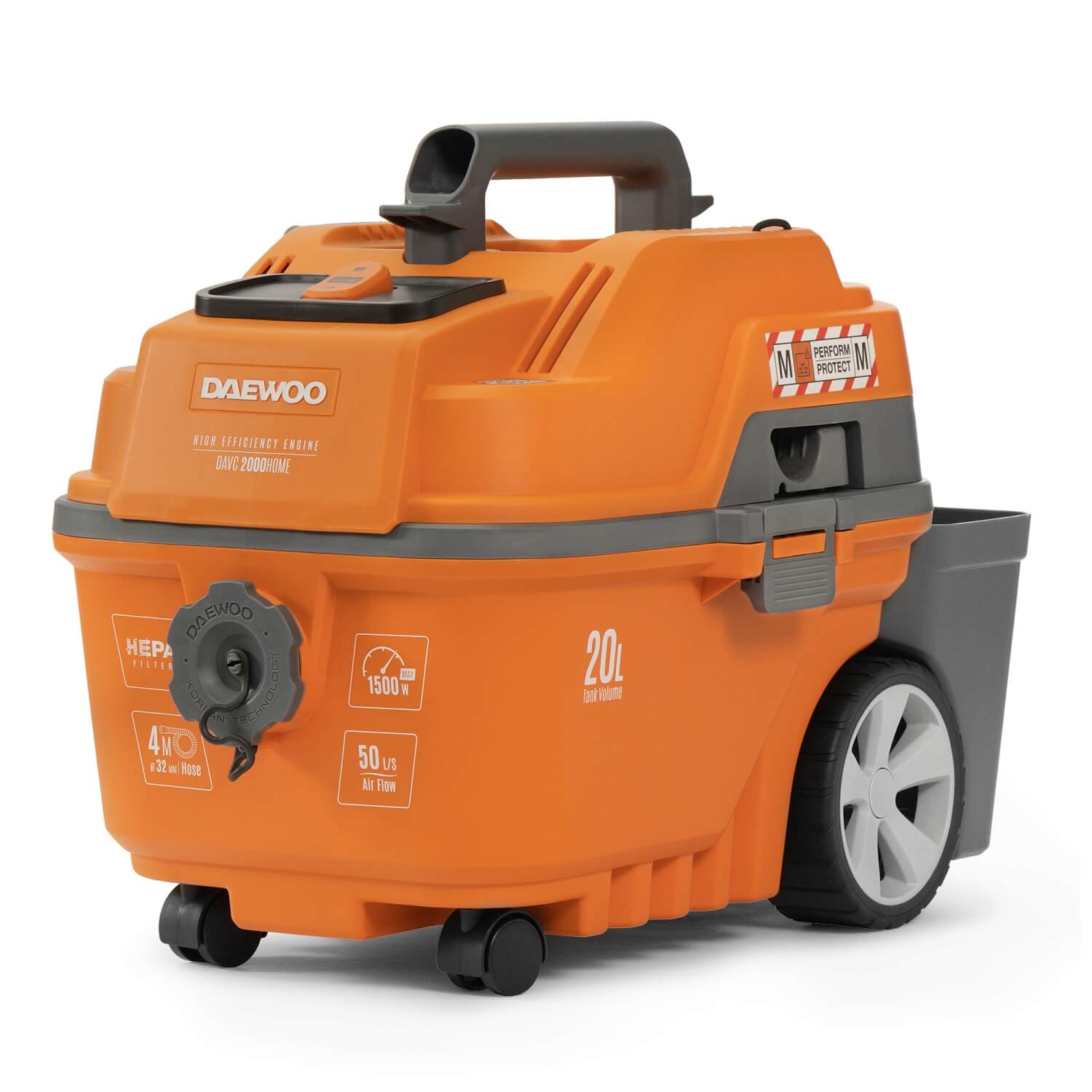 Электрический двигатель DAEWOO мощностью 1500 Вт в сочетании с высокопроизводительной турбиной обеспечивают разряжение 250 мбар и высокую производительность уборки.