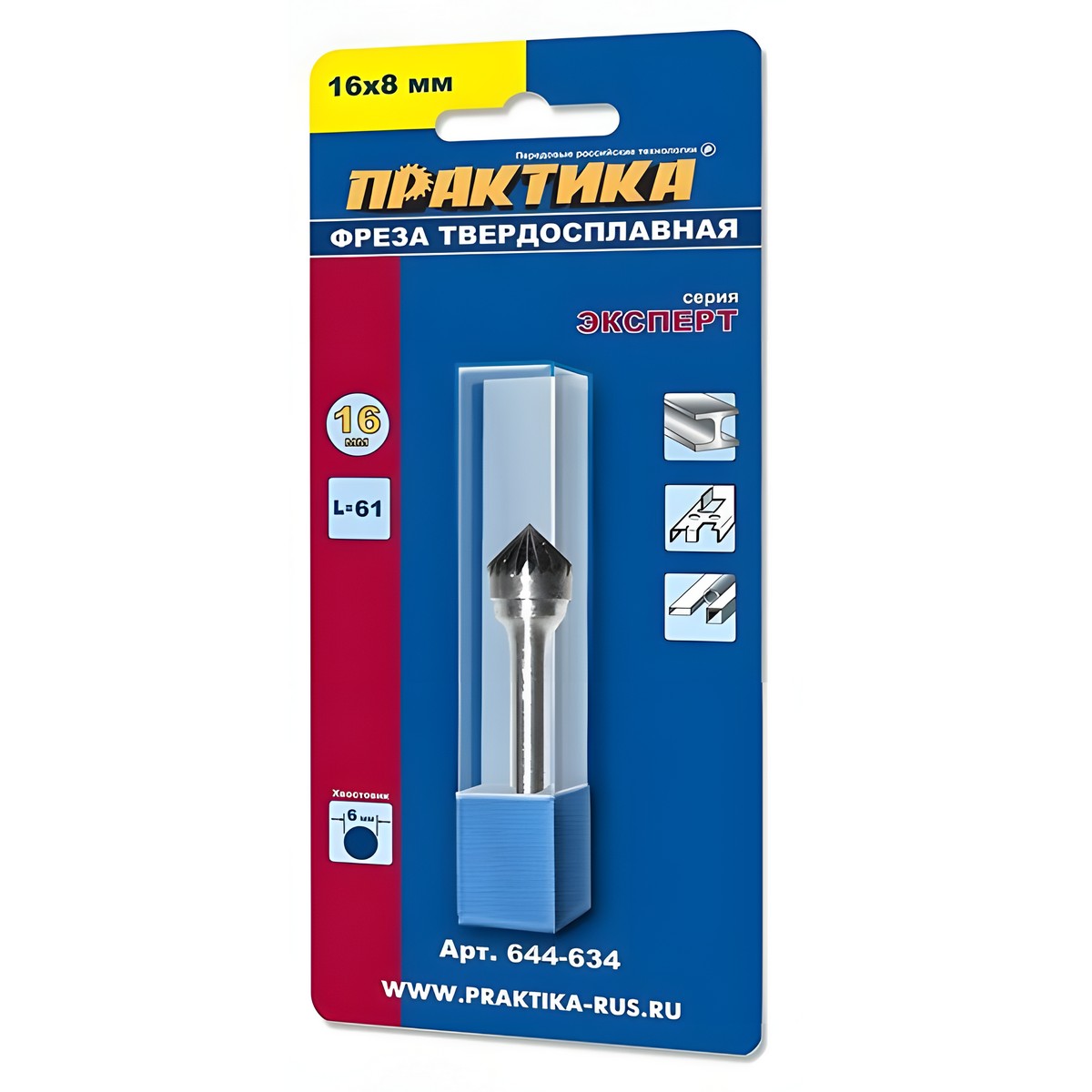 Фреза по металлу твердосплавная 16 х 8 х 61 мм (зенкер 90 градусов, тип K) ПРАКТИКА 644-634