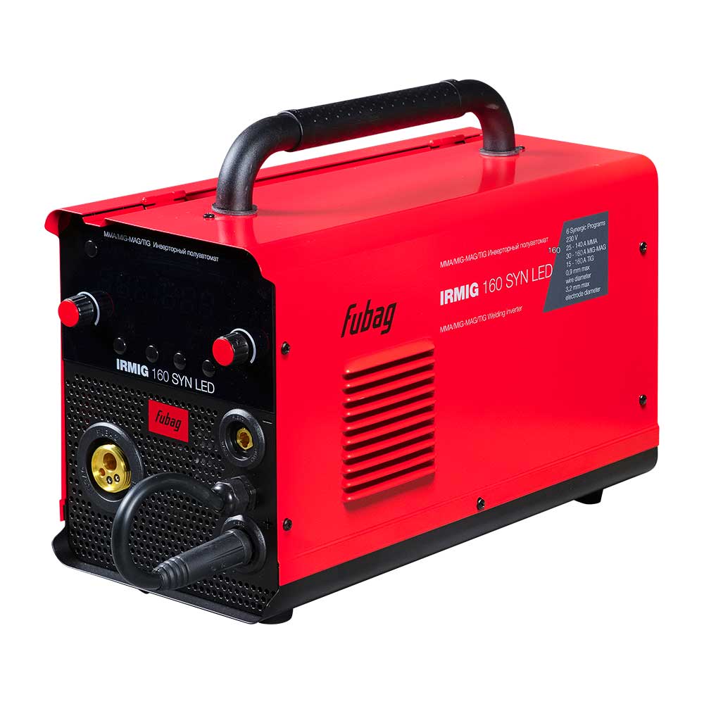 Передняя панель оснащена LED-дисплеем, регуляторами силы тока и скорости подачи проволоки, что позволяет быстро и просто выбирать режимы и оптимальные параметры сварки. Оснащен евроразъемом (Euro) для быстрого и безопасного подключения сварочной горелки. Купив сварочный инвертор IRMIG 160 SYN LED, вы получите в коробке фирменную горелку Fubag 150 А и газовый шланг, а также кабель с электрододержателем и кабель заземления. Продолжительность включения (ПВ) составляет 20% при 40°С (в соответствии с европейским стандартом EN60974-1). Сварочный полуавтомат Fubag IRMIG 160 SYN LED обладает легкой сменой полярности для работы с самозащитной проволокой. Эффективная система охлаждения, а также встроенная функция термозащиты с индикацией перегрева гарантируют долговечность и надежность использования аппарата в условиях интенсивной эксплуатации. Все технические характеристики наглядно и подробно указаны на корпусе аппарата.
