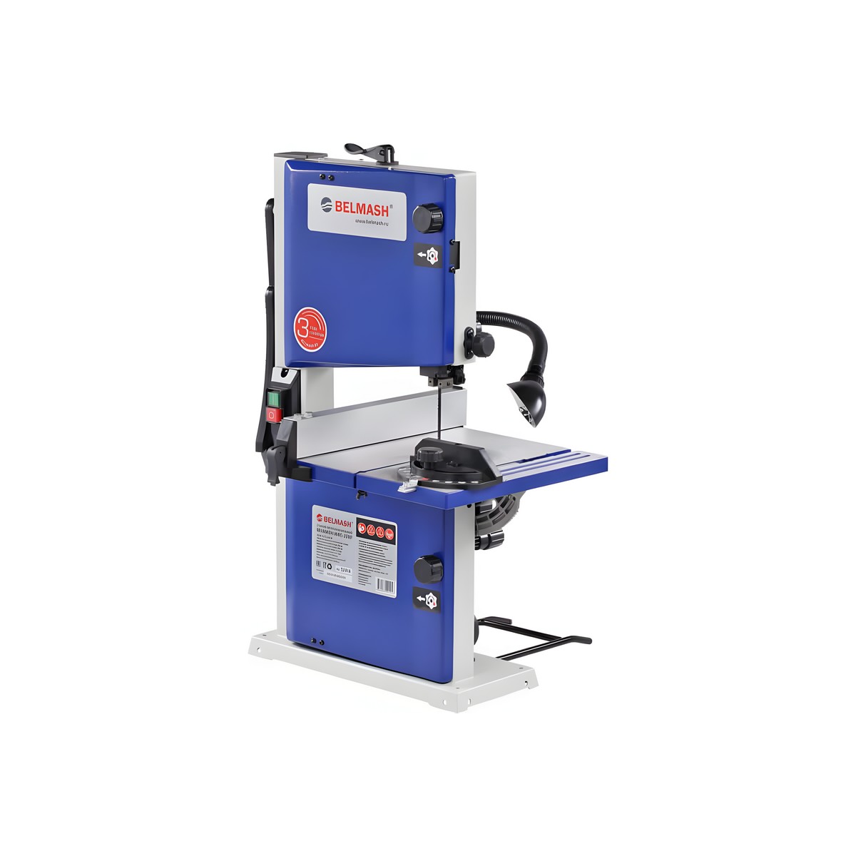 Питание станка осуществляется от однофазной сети переменного тока напряжением 230 В. Электродвигатель асинхронный, мощность - 400 Вт. Вращение от двигателя к шкивам передается с помощью ременной передачи. Скорость пильного полотна - 635 м/мин. Модель компактная, установка настольная.